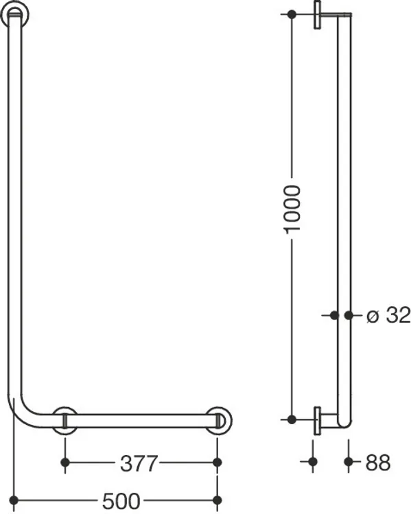 roestvrij staal, gepoedercoat, horizontale lengtes 500 mm, verticale lengte 1000 mm, Diameter 32 mm, Versie rechts, getest tot 200 kg bij gebruik met HEWI-bevestigingsmateriaal, Aanbevolen maximaal gewicht van de gebruiker: 150 kg, voldoet aan de eisen van SIA 500.