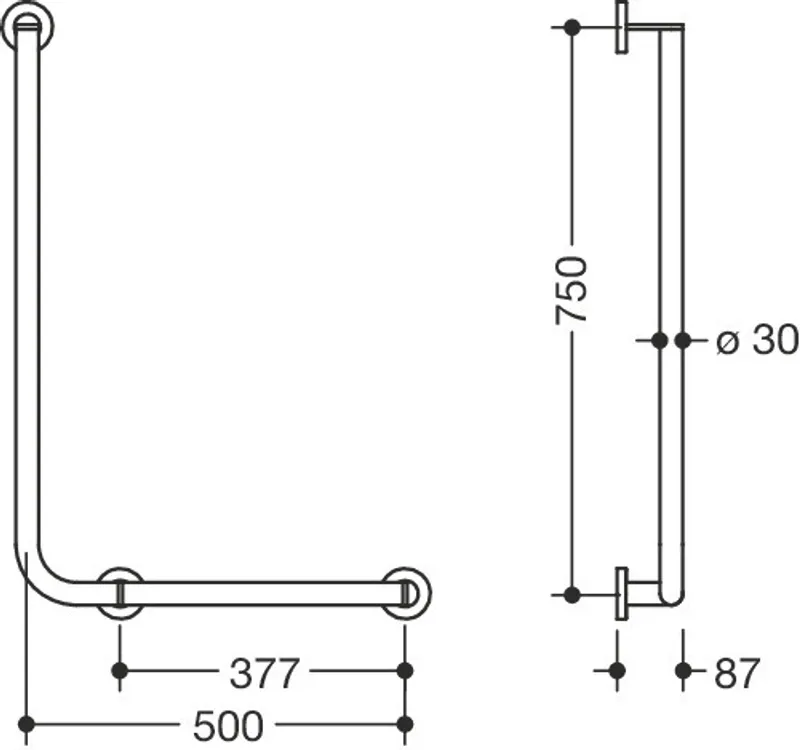 roestvrij staal, gepoedercoat, horizontale lengtes 500 mm, verticale lengte 750 mm, Diameter 30 mm, Versie rechts, getest tot 200 kg bij gebruik met HEWI-bevestigingsmateriaal, Aanbevolen maximaal gewicht van de gebruiker: 150 kg, voldoet aan de eisen van ÖNORM B1600/1601.