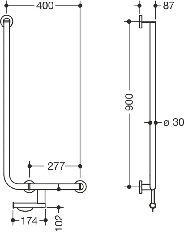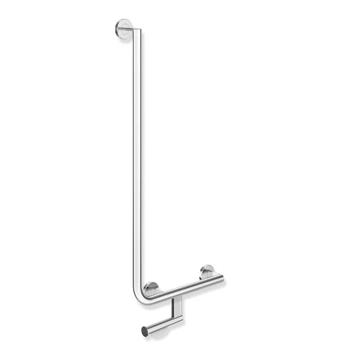Meer tonen roestvrij staal, verchroomd, horizontale lengtes 400 mm, verticale lengte 900 mm, Diameter 30 mm, Versie rechts, getest tot 200 kg bij gebruik met HEWI-bevestigingsmateriaal, Aanbevolen maximaal gewicht van de gebruiker: 150 kg.