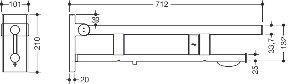 - Uitzwenking 700 mm, 210 mm breed en 101 mm hoog, Diameter bovenrail 33,7 mm, Diameter onderste rail 25 mm