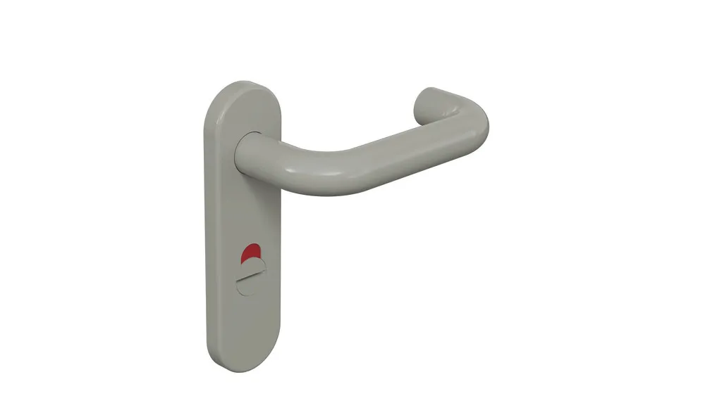 Schild: model 230.23RNR, schildonderconstructie met kunststof-roestvrij staal verbindingsconstructie, DIN links en DIN rechts toepasbaar. Vastdraaiende lagers van de deurkrukken met automatisch vastklikkende rondom-vergrendeling en 5 mm lagerpunt als onderhoudsvrij glijlager met elastisch compensatiebereik en tweede lager in de deurkruk nek. Verborgen, betrouwbare schroefverbinding met combinatie van M4 schroeven en hulsschroeven en steunpen binnenin het deurblad. WC-uitvoering met noodontgrendeling middels vierkantstift of munt en kijkschijf (weergave rood/wit) aan de buitenkant.