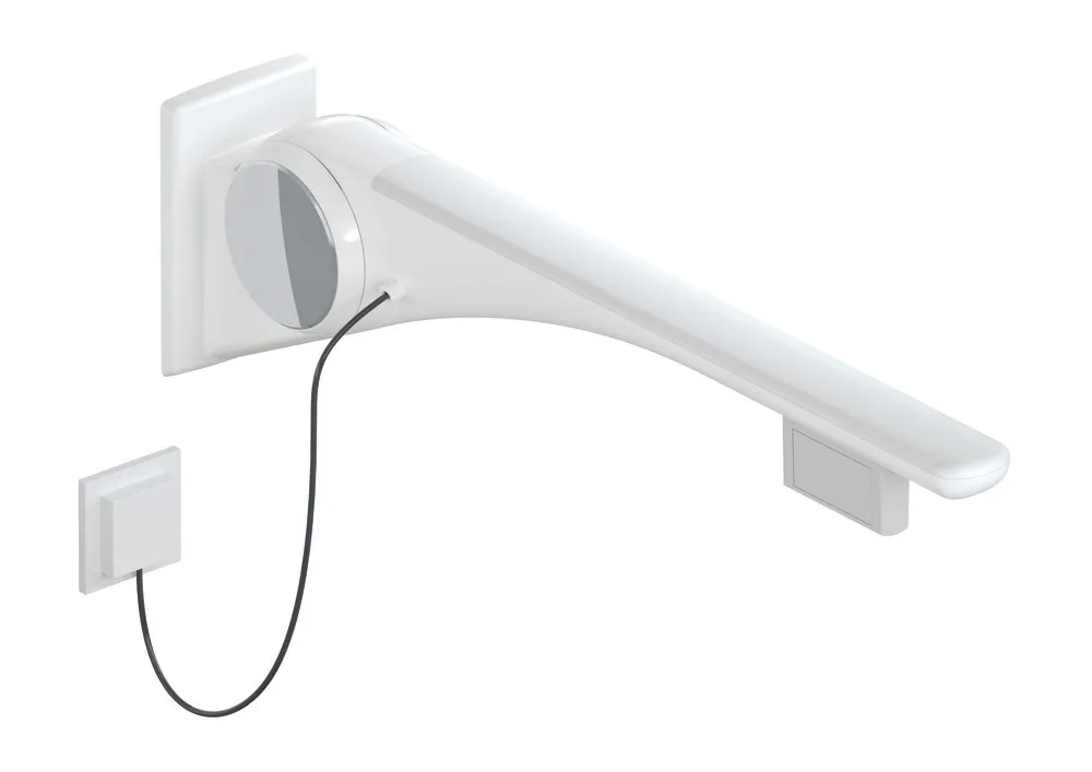 Vis mer Utkraging i aluminium, Pulverlakkert, blank med gripepute i plast, med høyglansforkromede designelementer, kunststoffoverflate av høy kvalitet og ripefast pulverbelegg, Utkraging 750 mm, med spyleutløsning (e-utførelse), Utførelse høyre, Enkel installasjon takket være separat montering av monteringsplaten i rustfritt stål, matt polert, Testet opp til 150 kg ved bruk med HEWI festemateriale, Anbefalt maksimal vekt for brukeren: 150 kg, er produsert i samsvar med CE- og UKCA-forordning (EU) 2017/745 om medisinsk utstyr, oppfyller kravene som gjelder i Belgia (CWATUPE, WVG Vlaanderen) med hensyn til utspringet på det sammenleggbare støttehåndtaket på toalettet.