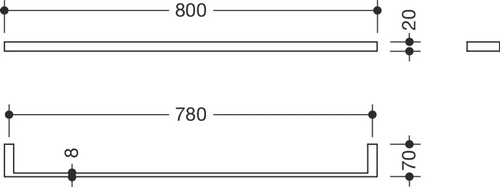 - 800 mm bred, 20 mm høy, 70 mm dyp
