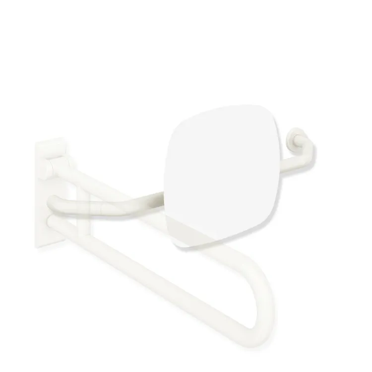 Vis mer Polyamid, høyglans, Ryggstøtte i plast i HEWI-farge 98 (signalhvit), Bredde 650 til 750 mm, Dybde 230 mm, Ryggstøtte 334 mm høy og 370 mm bred, Stangdiameter 33 mm, Veggmontering på én side med rosetter (venstre), ensidig montering på hengslede støtteskinner eller veggstøtteskinner med veggplate (til høyre).