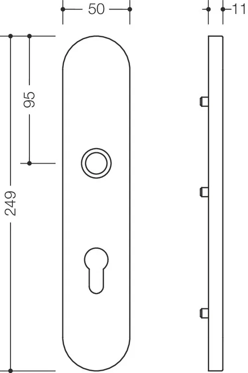 short stems, in H-technology, stainless steel, satin finish surface, for lever handle diameter 21.3 mm, backplate base made of synthetic material-steel composite, backplate cover cap, round, 50 x 249 mm, 10.5 mm high, 1.5 mm wall thickness, Supplied without screws.