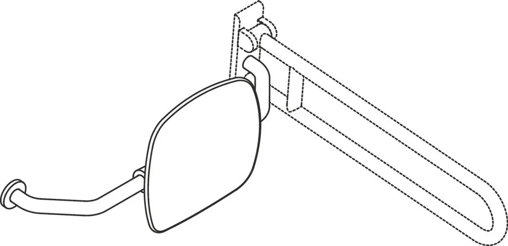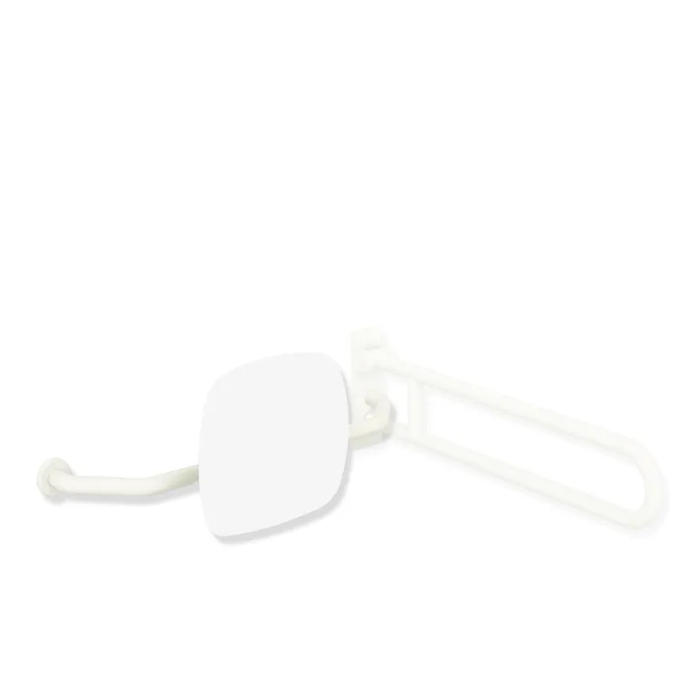 Pokaż więcej Poliamid, wysoki połysk, Plastikowe oparcie w kolorze HEWI 98 (biały sygnałowy), Szerokość 650 do 750 mm, głębokość 230 mm, Oparcie o wysokości 334 mm i szerokości 370 mm, Średnica pręta 33 mm, jednostronny montaż na ścianie z rozetami (po prawej), jednostronny montaż na składanych uchwytach lub uchwytach ściennych z płytą ścienną (po lewej).