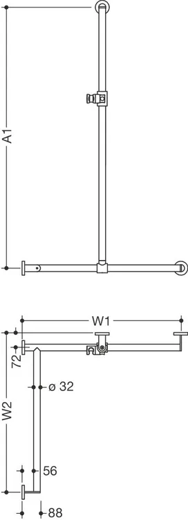 Stal nierdzewna, matowy polerowany, z bezstopniowo regulowanym uchwytem prysznicowym wykonanym z matowego poliamidu w kolorach HEWI 98 (biały sygnałowy) lub 92 (szary antracytowy), długość pionowa wykonywana na wymiar od 600 mm do 1250 mm, długości poziome (montaż narożny) wykonane w zakresie od 475 mm do 1800 mm, średnica 32 mm, Wersja lewostronna.