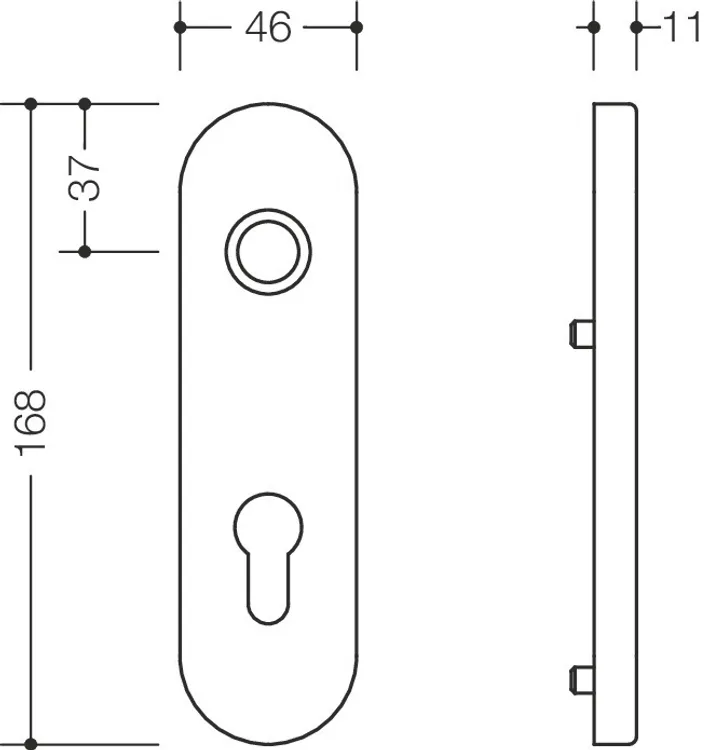 podbudowa szyldu z konstrukcji kompozytowej z tworzywa sztucznego/stali szlachetnej, stosowane dla DIN z lewej i DIN z prawej. Ukryte, odporne na odkręcenie połączenie śrubowe z kombinacją śrub M4 i tulei gwintowanych oraz czopy oporowe wpuszczone w skrzydło drzwi.