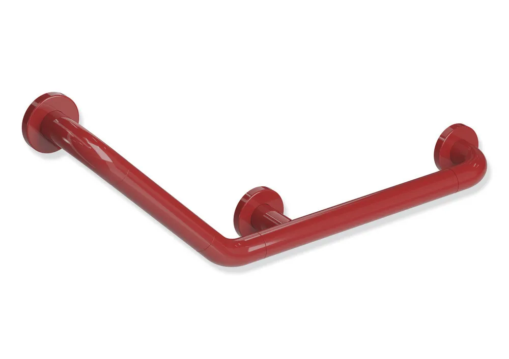 Pokaż więcej Poliamid, wysoki połysk, Wymiary osi 620 mm i 200 mm, kąt 135°, 200 mm wysokości, Średnica 33 mm, do montażu z lewej i prawej strony, Przetestowano do 200 kg w przypadku użycia z materiałem mocującym HEWI, Zalecana maksymalna waga użytkownika: 150 kg.