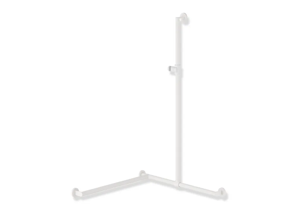 Rostfritt stål, Pulverlackerad, med steglöst justerbar duschhuvudhållare av matt polyamid, Vertikal längd 1250 mm, Horisontella längder (hörnmontering) 765 mm, Diameter 32 mm, Utförande till vänster, testad upp till 200 kg när den används med HEWI fästmaterial, Rekommenderad maxvikt för användaren: 150 kg.