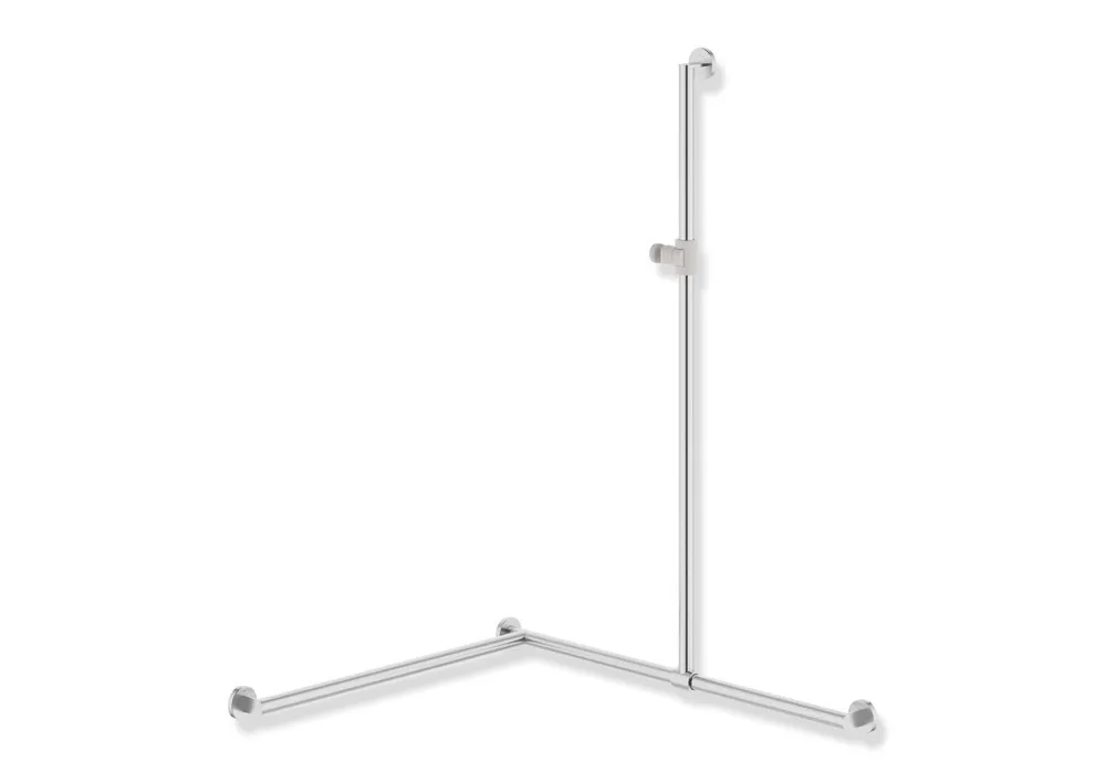 Tillverkad av högkvalitativt rostfritt stål, matt polerad, Vertikalt och horisontellt placerade stänger med fästrosetter och duschhållare, med duschhållare som kan flyttas i sidled (för montering), Utförande till vänster, Vertikal längd 1250 mm, Horisontella längder (hörnmontering) 800 mm och 800 mm, 70 mm djup, Stångdiameter 32 mm, Rörets tjocklek 2 mm, Rosettens diameter 70 mm, Kan belastas med upp till 150 kg, Duschhållare som är av högkvalitativ matt polyamid i HEWI färgerna 98 (signalvit) och 92 (antracitgrå), Lämplig för handduschar från olika tillverkare, inklusive korrosionsfritt HEWI fästesmaterial, Uppfyller kraven i 2010 års ADA-standarder och ICC/ANSI A117.1-2017.