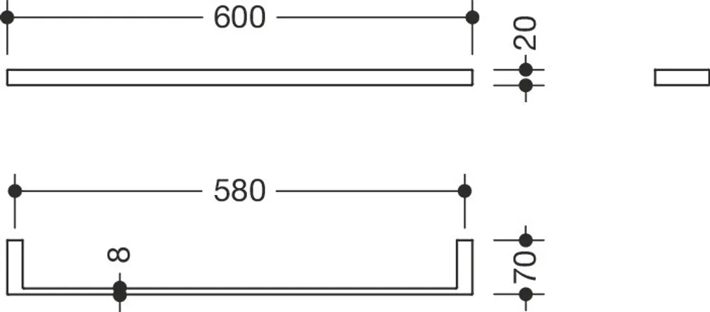 - 600 mm bred, 20 mm hög, 70 mm djup